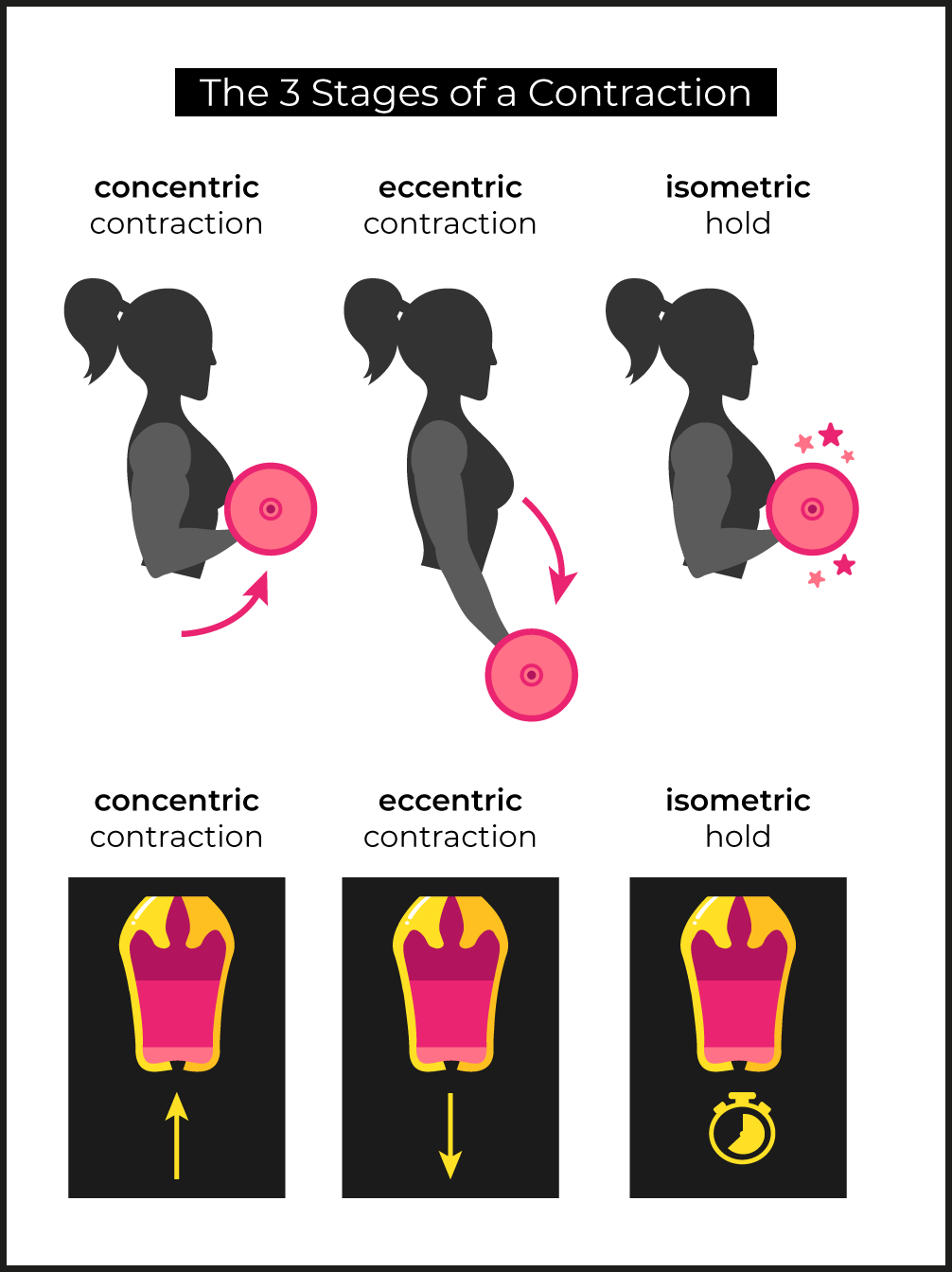Think of a kegel like a dumbbell curl for your pelvic floor: you’re lifting the muscles up, holding briefly, and then relaxing. Over time, these repeated contractions make the muscles stronger, more controlled, and easier to activate.